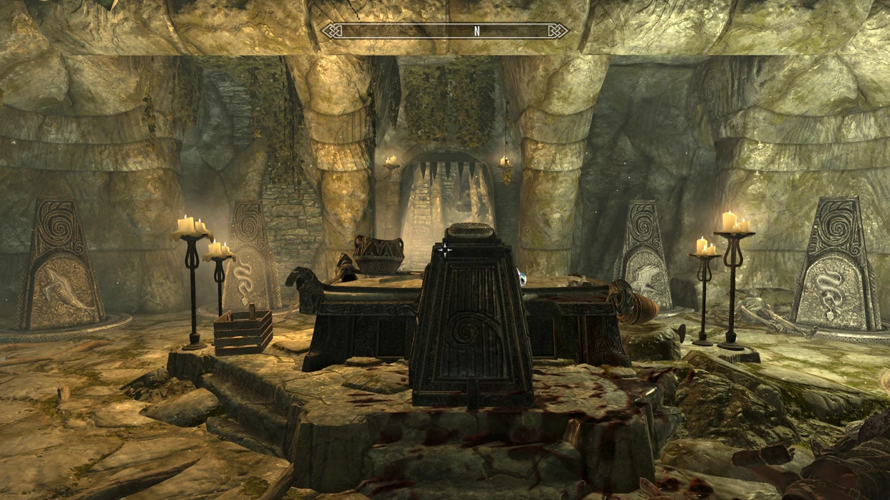 Near the entrance is a medium sized camp indicating someone who is found to be daynas valen has been in the ruin before. Once you have them in the correct order pull the chain in the main room to open the trap door in the floor and gain.